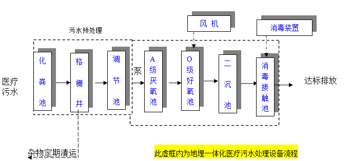 醫(yī)院污水中有機(jī)類雜質(zhì)較多, CODcr 、BOD5均較高,且BOD5/CODcr之值大于0.4,生化性能較好。因此宜采用以生化為主加消毒的工藝處理流程。因污水水量較小,生化設(shè)備采用地埋式一體化醫(yī)療污水處理設(shè)備。