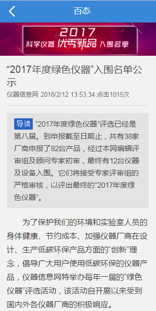 四川卓越水處理 實驗室廢水處理設(shè)備 成功入圍“2017年度綠色儀器”優(yōu)秀新品為了保護我們的環(huán)境和實驗室人員的身體健康、節(jié)約成本、加強儀器廠商在設(shè)計、生產(chǎn)低碳環(huán)保產(chǎn)品方面的“創(chuàng)新”理念,倡導廣大用戶使用低碳環(huán)保的儀器產(chǎn)品,儀器信息網(wǎng)特舉辦每年一屆的“綠色儀器”評選活動,我們公司的產(chǎn)品“實驗室廢水處理設(shè)備”也在這次活動中積極的參加“綠色儀器”優(yōu)秀新品活動,38家廠商共82臺產(chǎn)品,接受專家評審組的嚴格審核,最終有12臺儀器及設(shè)備入圍。并且我們四川卓越水處理的產(chǎn)品“實驗室廢水處理設(shè)備”成功的入圍“201...