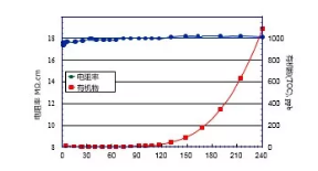 我們向純水水箱中逐漸加入蔗糖(有機物),水箱里的水再經(jīng)過超純水機純化,觀察超純水的電阻率和TOC數(shù)值的變化,如下圖: